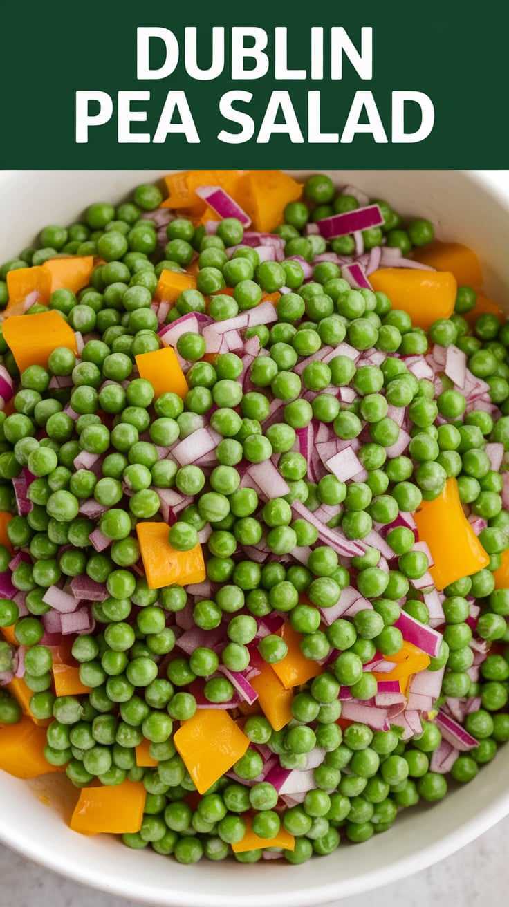 The name “Dublin Pea Salad” pays homage to the hearty, homestyle dishes of Ireland — where peas, cheese, and creamy dressings are everyday comforts. While it’s not a historical Irish recipe in the strictest sense, it embodies the same spirit: simple ingredients, rustic presentation, and big, bold flavor.